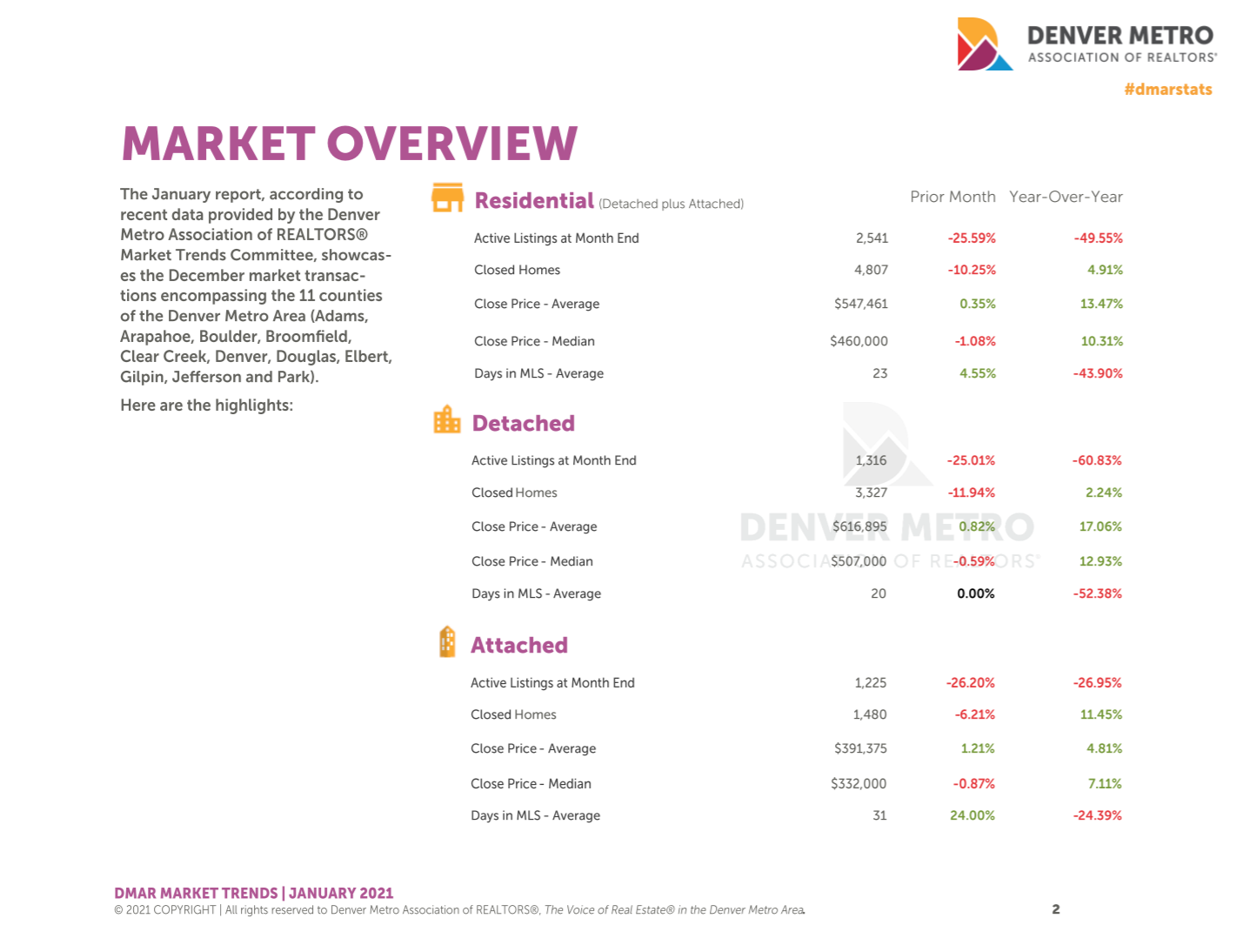 Take a look at the Denver Metro Association of Realtors’ Market Overview for December 2020. In looking at all residential listings for 11 Metro Denver counties, active units are down 25.59% from November, and 49.55% from December 2019! Average close price is at $547,461 ($616,895 for detached and $391,375 for attached). Closed transactions, while down from November, are still up from December 2019 - that monthly dip is likely only an result of low inventory and not indicative of reduced demand.